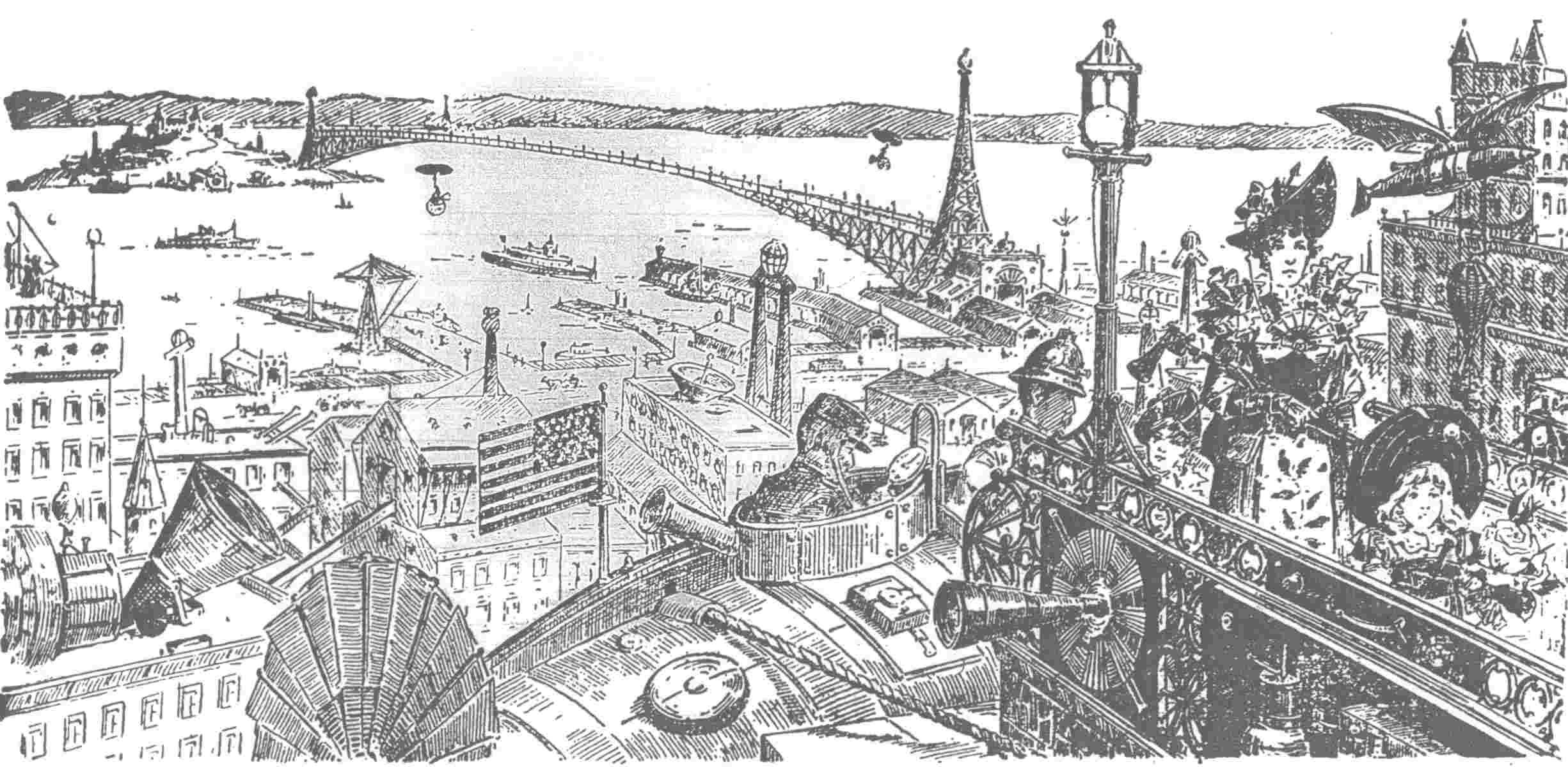 INSPIRED—The Examiner artist who had this vision of San Francisco in 1929—the picture was drawn in 1889—surely was gifted with second sight. For there is the bridge, springing from Rincon Hill to Yerba Buena Island and to Oakland. And there is a flying machine. Really, that was too much for San Francisco who opened their papers that morning on December 29, 1889. The nonchalant group on the roof-top at the right apparently is waiting to board the flying contraption, wholly imaginary, and, to 1889, fantastic ancestor of the China Clipper. The town chuckled over this artistic prophecy. Today San Franciscans casually cross the bridge.