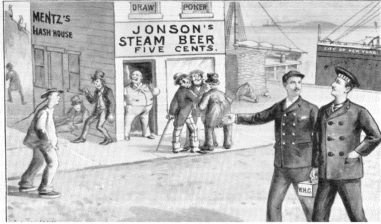 The first thing I saw, as Charlie and I came out of the Pacific Mail dock gate at the junction of First and Brannan Streets and Mission Bay, were numbers of whisky and beer saloons and chop houses. These drinking places were not like the halfway decent-looking lager beer saloons which are so conspicuous along Market and Kearney Streets, on account of the big "V" that adorns the door and front windows of the places where the dudes of the Cooke-Nosegrave-Mearns-Irving-Johnny Powers free lunch cliques are generally to be found nearly at the time. They were low, filthy-looking places, with vulgar signs on their windows which read "Steam Beer, five cents."