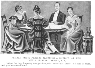 "Fitzgerald was a not in the party when Mr. Fruit-tree dropped the money aforesaid; but he was there on many other occasions, and he was a sharer in the general fund that was raked in. Furthermore, it is said that Mr. Fruit-tree was not the only victim, but that man after man had been invited to the Sutter Street home of the "fruit-pickers," as they play playfully style themselves, and that their gains would probably foot up eight thousand or ten thousand dollars.