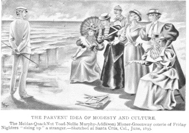 All of this talk about young persons being able to acquire refined and courteous manners* without home training or the natural inheritance of certain gentle instincts from gentle mothers, is utter nonsense. Let me converse with a lady for fifteen minutes and I will come so near telling you what kind of parents and what sort of home training she has had, and what class of society she really belongs to, that you would have a pretty hard time finding any very serious mistakes in my humble opinions on this particular subject. You can tell the genuine from the counterfeit the very minute you hear the ring. Take the Mackay-Delmas-Quacknut-Mizner-Oelrichs-Fair-Flood-o'Brien-Catherwood-Greenway combination of "gentility" for example, and compare its style of "courtesy" and "politeness" with the unmistakable genuineness and real refinement of the Eddys, the Fritzes, the Hortons, the Halseys, the Rices, the Phillipses, the Admiral Skerretts, the Phelpses, the Belknaps, the Teresis, the Estees, the Dickinsons, the Grahams, the Buntings, the Stoneys, the Caseys of the army, or any others of that good and unpretentious class of old, reliable, home-loving citizens, and note the difference between the two elements.