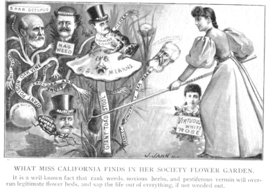 Get down on thy knees, foolish, deluded citizens, and worship thy sovereign, "King" Collis the First; bring along the fairest and purest of thy young girls, the flowers of thy households, and present them as sacrifices; lay them at the feet of thy king that the favorite of his harem--with whom he lived for years before marrying her--may select the choicest morsels for her sultan, and then bid the nobility, Princes Crocker, Sharon, Fair, Sage, Mills, Flood, Markham, Paxton, Daggett, Dimond, Tobin, Gould de Young, et. al., to draw lots for second choice. After this, the lesser nobles,--the court hangers-on, so to speak,--like Delmas, Quack-Nut, Goad, Mizner, McBean-eater, New-it-all, Wise, Sheldon, and Casserly will be admitted.