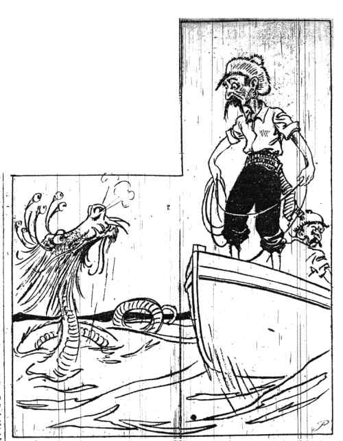 They decided that it probably was metal work attached to a chunk of wreckage which might be worth saving. They decided to save it. They took down the sail of their boat and rowed to within a few feet of the object. One of them took a heaving line and was swinging it around his head preparatory to lassoing the treasure when there came a sudden roar. The object of their attention suddenly rushed through the water at terric speed and as it gained headway there appeared above the surface a great green body that disappeared again in a cloud of smoke.