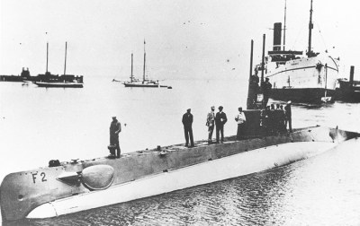 "USS F-2, a 330-ton F-1 class submarine built at San Francisco, California, was commissioned in June 1912. She had originally been named Barracuda, but was renamed F-2 in November 1911, prior to being launched. The submarine served in West Coast waters for her entire career, except for August 1914 through November 1915, when she was based at Honolulu, Hawaii. In September 1919 she was placed in commission, in reserve, for training purposes. Designated SS-21 in July 1920, when the Navy implemented its hull number system, USS F-2 was formally decommissioned in March 1922 and sold in August of that year."