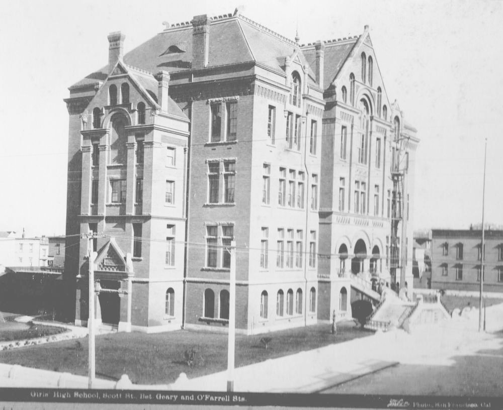 The school was located in an old brick building previously occupied by the Denman Grammar School, on the corner of Bush and Stockton streets. A new twelve-class building was erected for the school in 1870 on the fifty-vara lot on which the old brick building was located. The school was transferred to this building in 1870. In 1871, a fourteen-class building was erected on Bush street, near Hyde street; and the school was transferred to that location on 5 July 1871. The frame building at Bush and Hyde streets was destroyed by fire in 1890. While being rebuilt, classes were initially held in Cogswell Polytechnic High at Twenty-sixth and Folsom, and later at a primary building on Golden Gate Avenue and Hyde street. A new four-story, red brick building was built on Geary, O'Farrell and Scott. The school moved into it in 1892. This building was severely damaged in the 1906 disaster. While it was being rebuilt, the school moved to Lowell, then to Commerce, then to temporary shacks at the old site, and finally into temporary quarters on Hamilton square for three years. The school was once again victim to a fire in 1933. The school held classes at Everett Junior High until 1935. The school stayed at the same location until it was closed in June 1952; the explanation of its closing due to population shifts and the city's program of neighborhood high schools. The building was remodeled and became home to the new co-educational Benjamin Franklin Junior High.