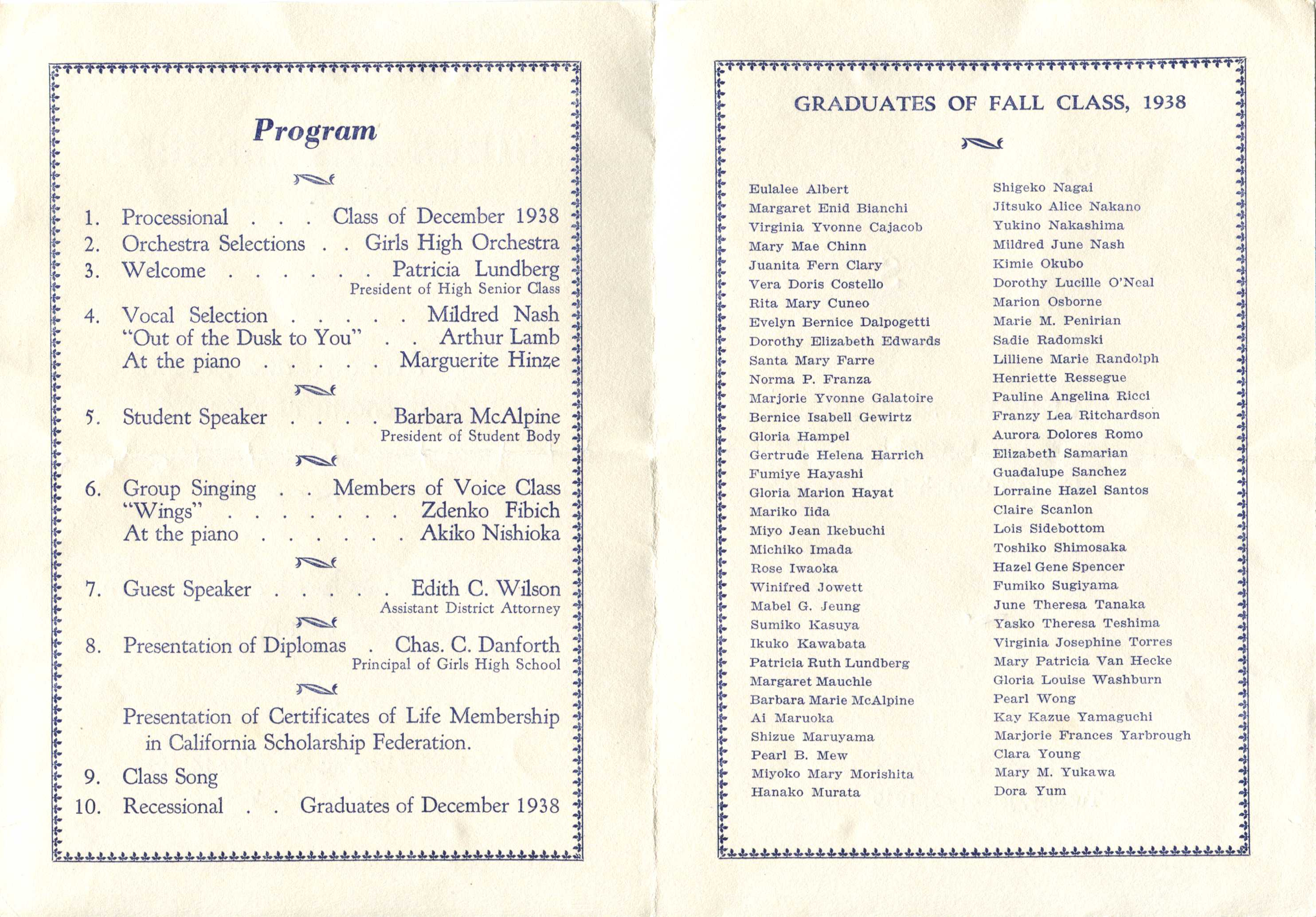 Jitsuko Alice Nakano Yukino Nakashima Mildred June Nash Kimie Okubo Dorothy Lucille O'Neal Marion Osborne Marie M. Penirian Sadie Radomski Lilliene Marie Randolph Henriette Ressegue Pauline Angelina Ricci Franzy Lea Ritchardson Aurora Dolores Romo Elizabeth Samarian Guadalupe Sanchez Lorraine Hazel Santos Claire Scanlon Lois Sidebottom Toshiko Shimosaka Hazel Gene Spencer Fumiko Sugiyama June Theresa Tanaka Yasko Theresa Teshima Virginia Josephine Torres Mary Patricia Van Hecke Gloria Louise Washburn Pearl Wong Kay Kazue Yamaguchi Marjorie Frances Yarbrough Clara Young Mary M. Yukawa Dora Yum |